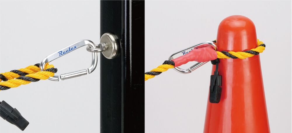 ロープの先端はD型カラビナ付きで、固定したい場所に引っ掛けられます。